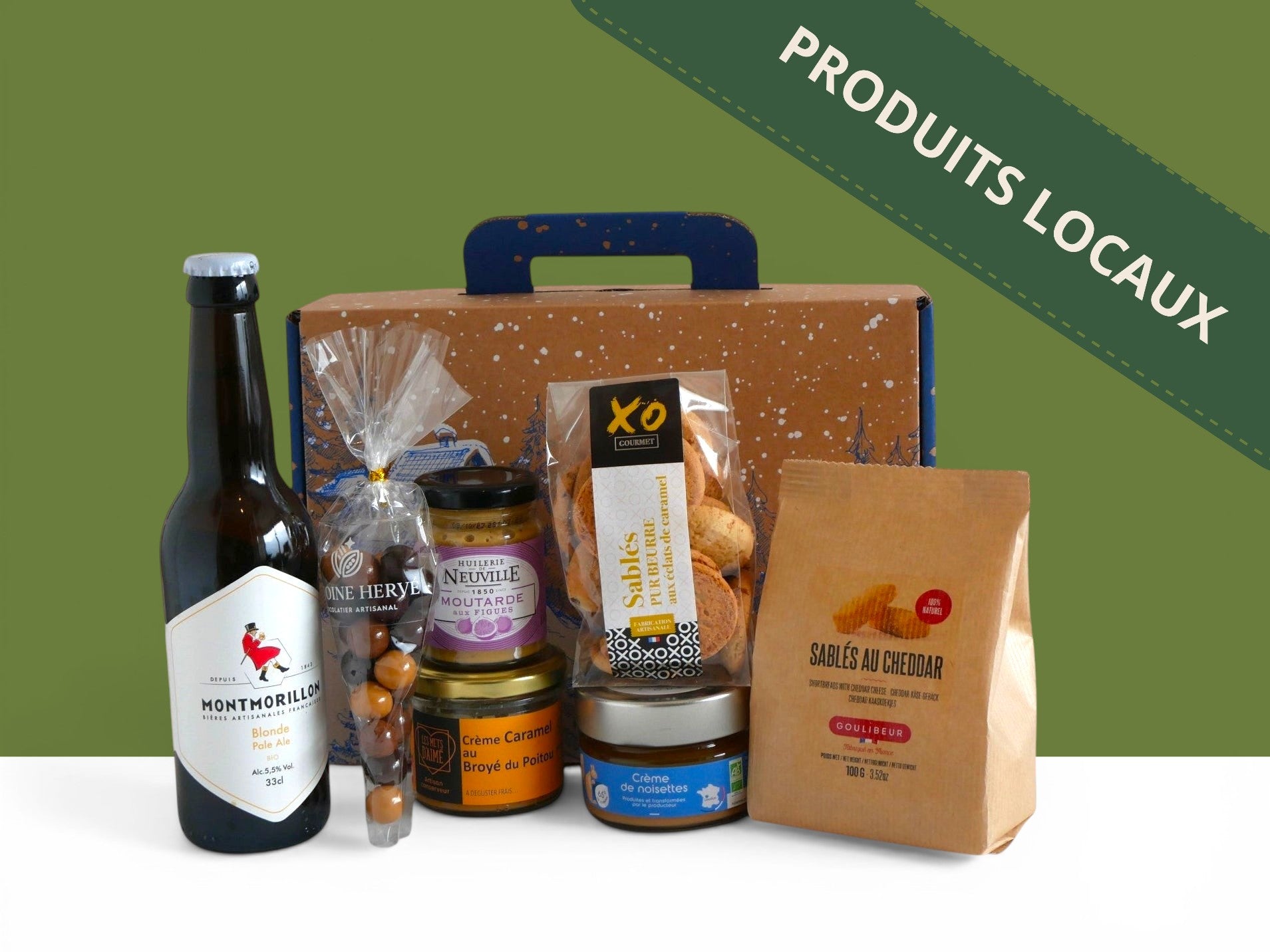 Pensé pour faire découvrir la richesse de notre territoire, ce coffret associe des saveurs apéritives gourmandes, comme des sablés au cheddar et une moutarde à la figue, à des douceurs sucrées généreuses avec une crème caramel au broyé du Poitou, une crème de noisette et des billes chocolatées croustillantes. Le tout est accompagné d’une bière blonde bio de Montmorillon, pour une dégustation locale, conviviale et pleine de caractère.