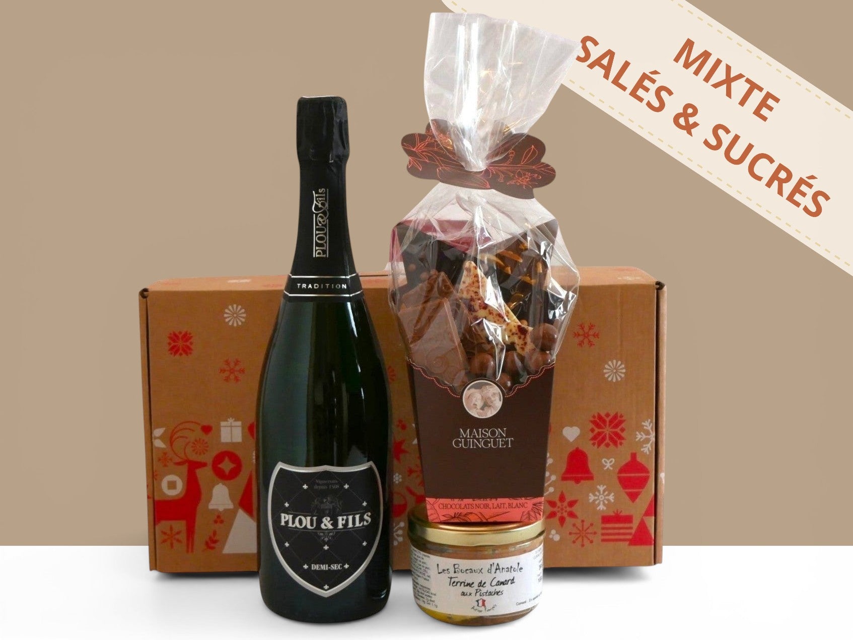 Pensé pour marier douceur et caractère, ce coffret réunit une terrine de canard aux pistaches, généreuse et savoureuse, à un assortiment de chocolats fondants. Le tout est accompagné d’un vin blanc pétillant demi-sec, pour une dégustation festive, délicate et pleine de gourmandise.